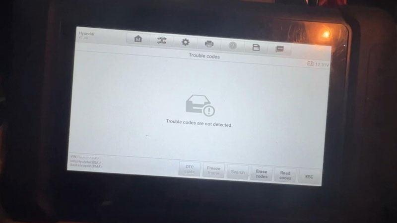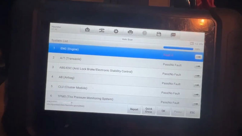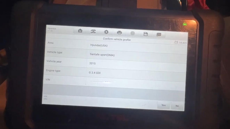 Hey, we’re working on a 2015 Hyundai Santa Sport, it’s a push-start vehicle. There’s a check engine light on the dash, so we’re gonna use Autel MaxiIM IM508S to diagnose and see what fault codes there are.