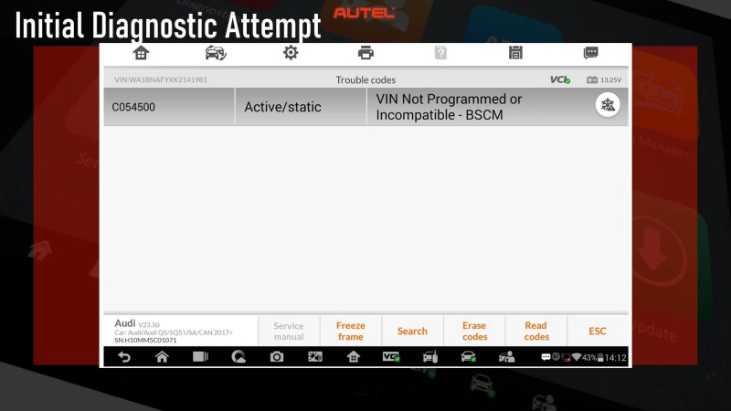 Swapping a BCM for testing can cause the original module to lose VIN synchronization, resulting in fault code C054500. This guide explains the repair process using the Autel IM608 II for initial diagnosis and Odis for final programming.