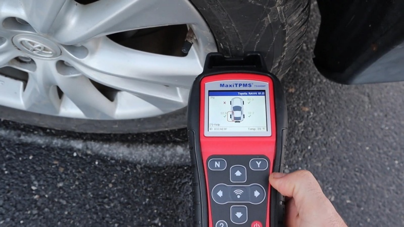 The tool then guided me to scan each sensor. I held the tool near each valve stem and pressed the button to trigger it. It quickly identified that the front left sensor wasn’t responding, while the other three showed correct pressure readings around 32 PSI.