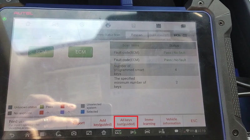 Select Ford > Automatic Selection to read the VIN > Ford > Edge > 2021- > Smart Key > IMMO Status Scan > Quick Erase DTC to ensure the system is clear.