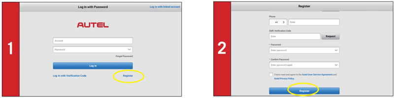 If you do not have an Autel account, tap Register on the Log-in screen(The register screen will appear).