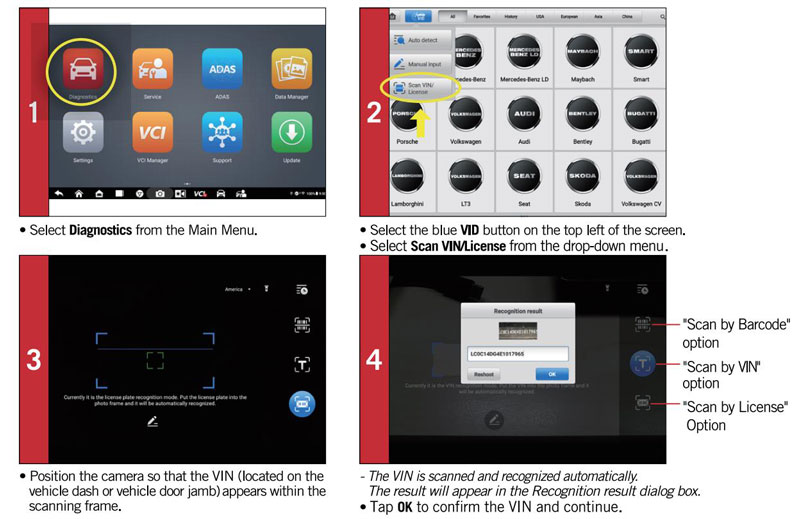 - Go to Diagnostics > tap the ID button > select Scan VIN/License.