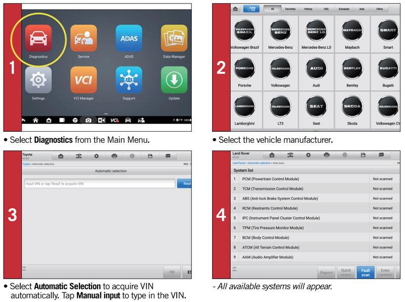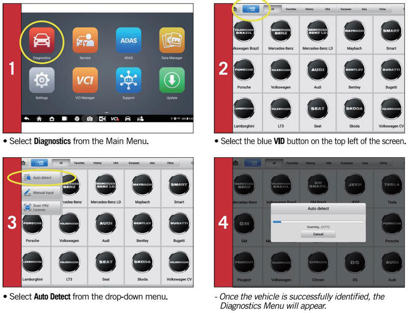 - From the main screen, select Diagnostics > tap the Blue VID button > choose Auto Detect.